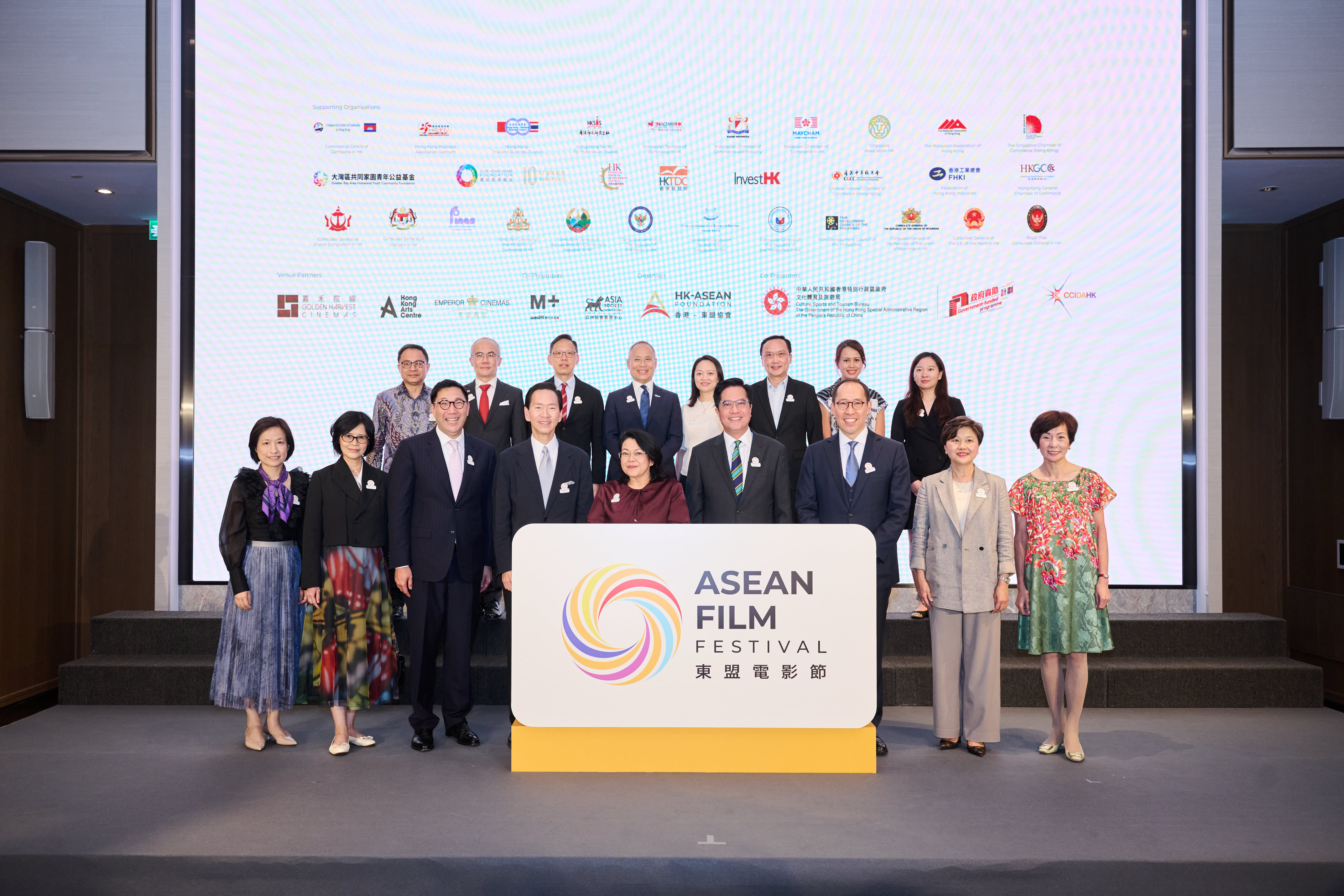 The Honourable Michael Wong Wai-lun, GBS, JP, Acting Financial Secretary of the Government of HKSAR (front row, fourth from left), Mrs Ainatol Zahayu Mohammad, Dean of the ASEAN Consuls-General and Consul-General of Brunei Darussalam in Hong Kong (front row, middle), The Honourable Bernard Charnwut Chan, GBM, GBS, JP, HK-ASEAN Foundation Advisory Council Member (front row, fourth from right) and Mr Daryl Ng Win-kong, SBS, JP, Chairman of Hong Kong-ASEAN Foundation (front row, third from left), alongside representatives from supporting organisations, who have greatly enriched the Festival’s engagement.
